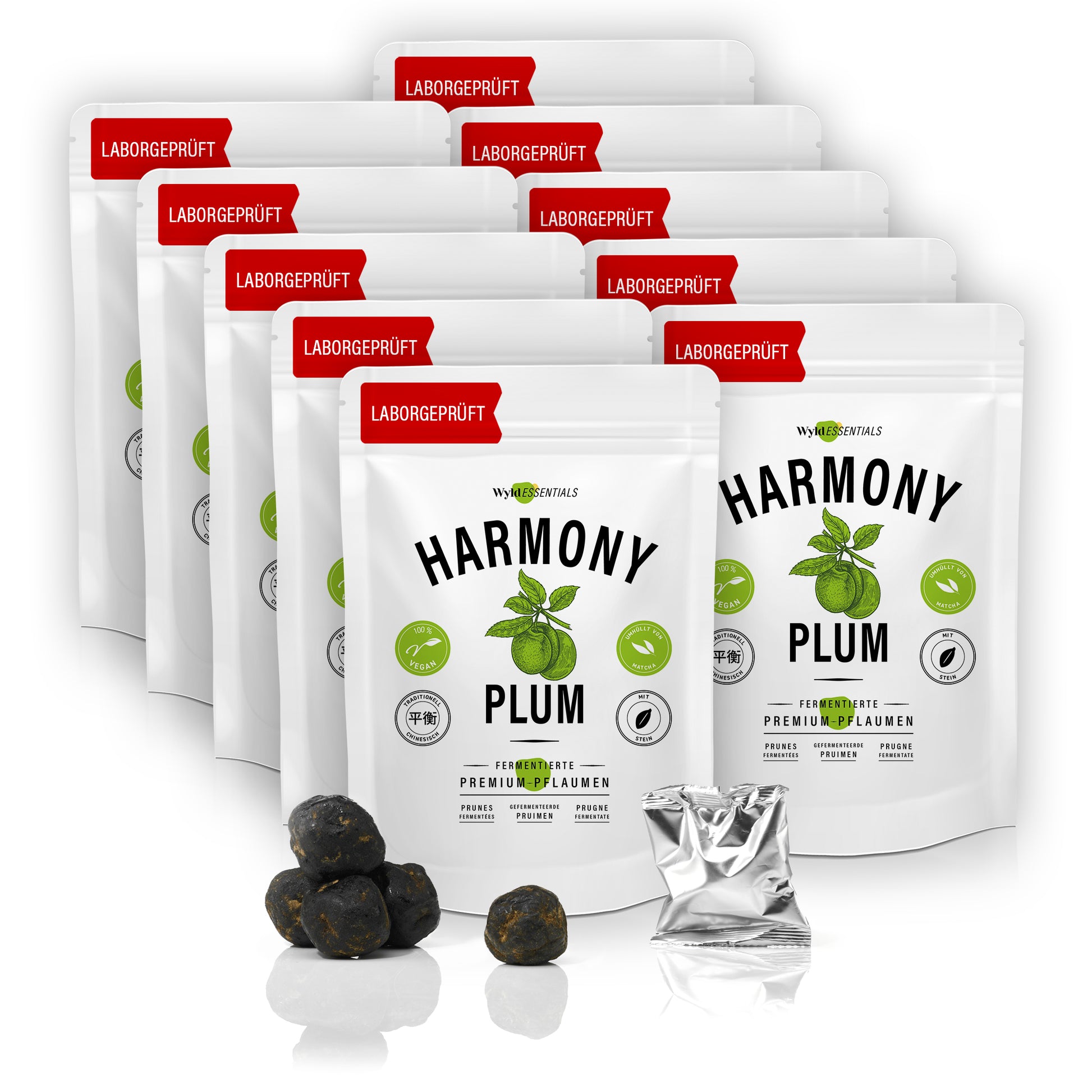 HarmonyPLUM. 90 sorgfältig fermentierte grüne Pflaumen. Nach traditionell chinesischem Rezept. Umhüllt von Macha-Pulver. Laborgetestet in Deutschland