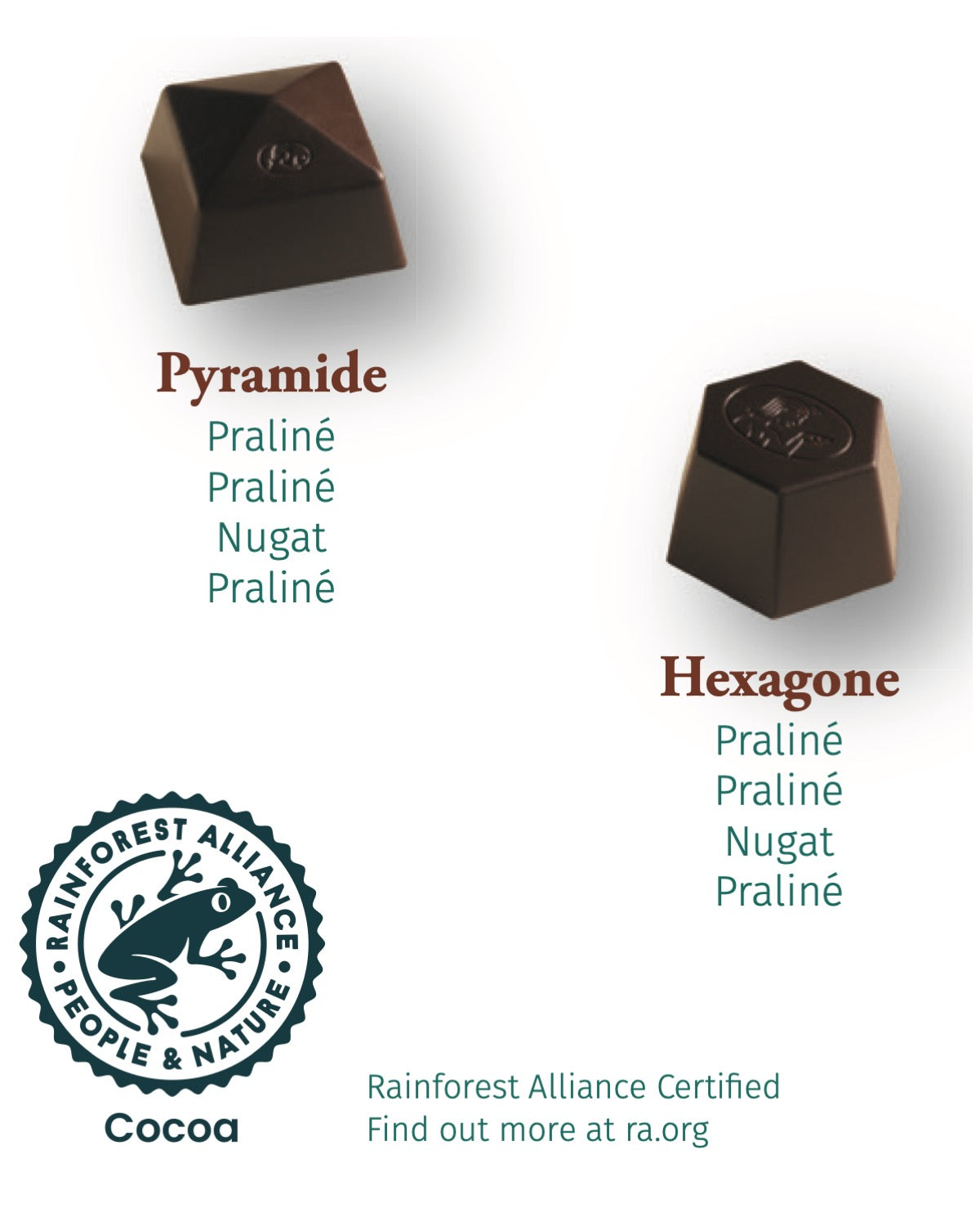 - Palmier. Milchschokolade trifft auf exotische Kokos-Ganache. Ein sinnlicher Genuss mit tropischem Flair! Surprise. Cremige Praliné-Füllung mit karamellisierten Nüssen, umhüllt von zarter Milchschokolade. Eine köstliche Überraschung! Hexagon. Intensiver Genuss: Dunkle Schokolade mit feiner Praliné-Füllung. Für echte Schokoladenliebhaber! Pyramid. Luxuriöse dunkle Schokolade mit edler Praliné-Füllung. Ein Geschmackserlebnis mit Charakter!