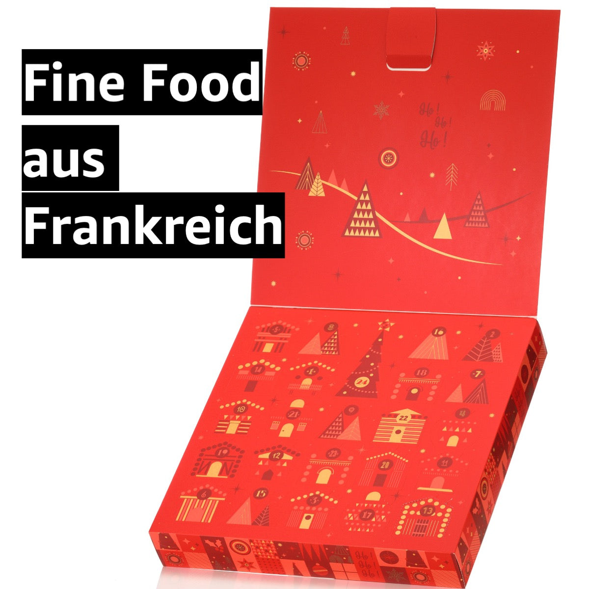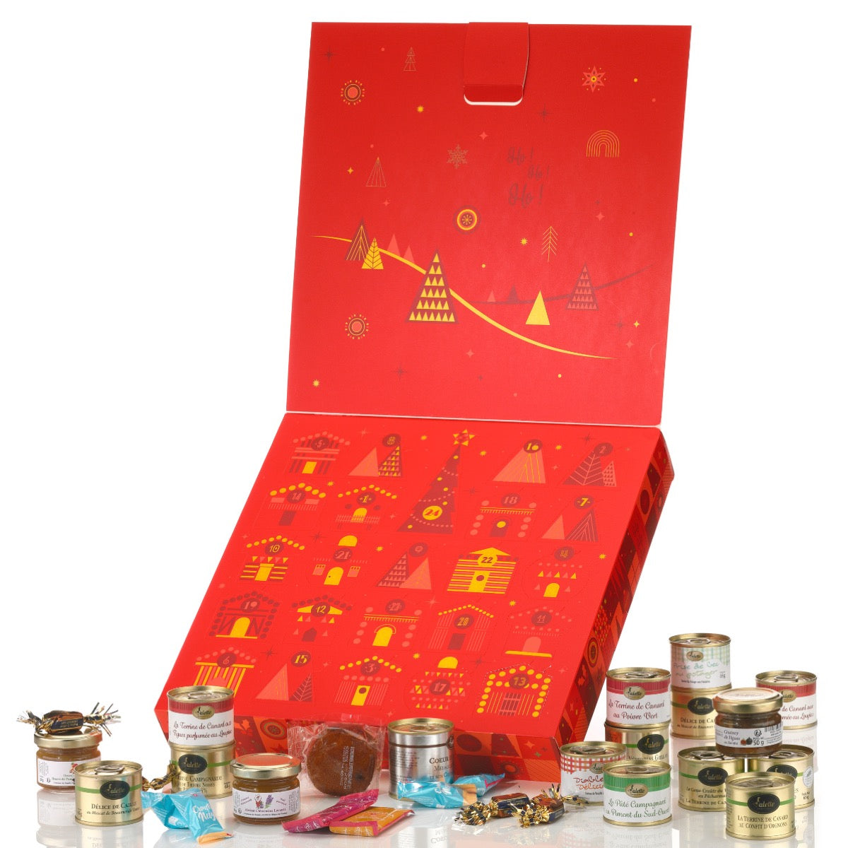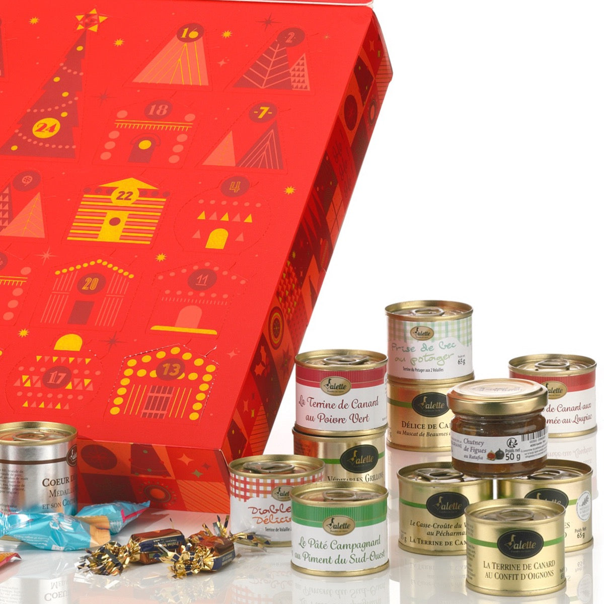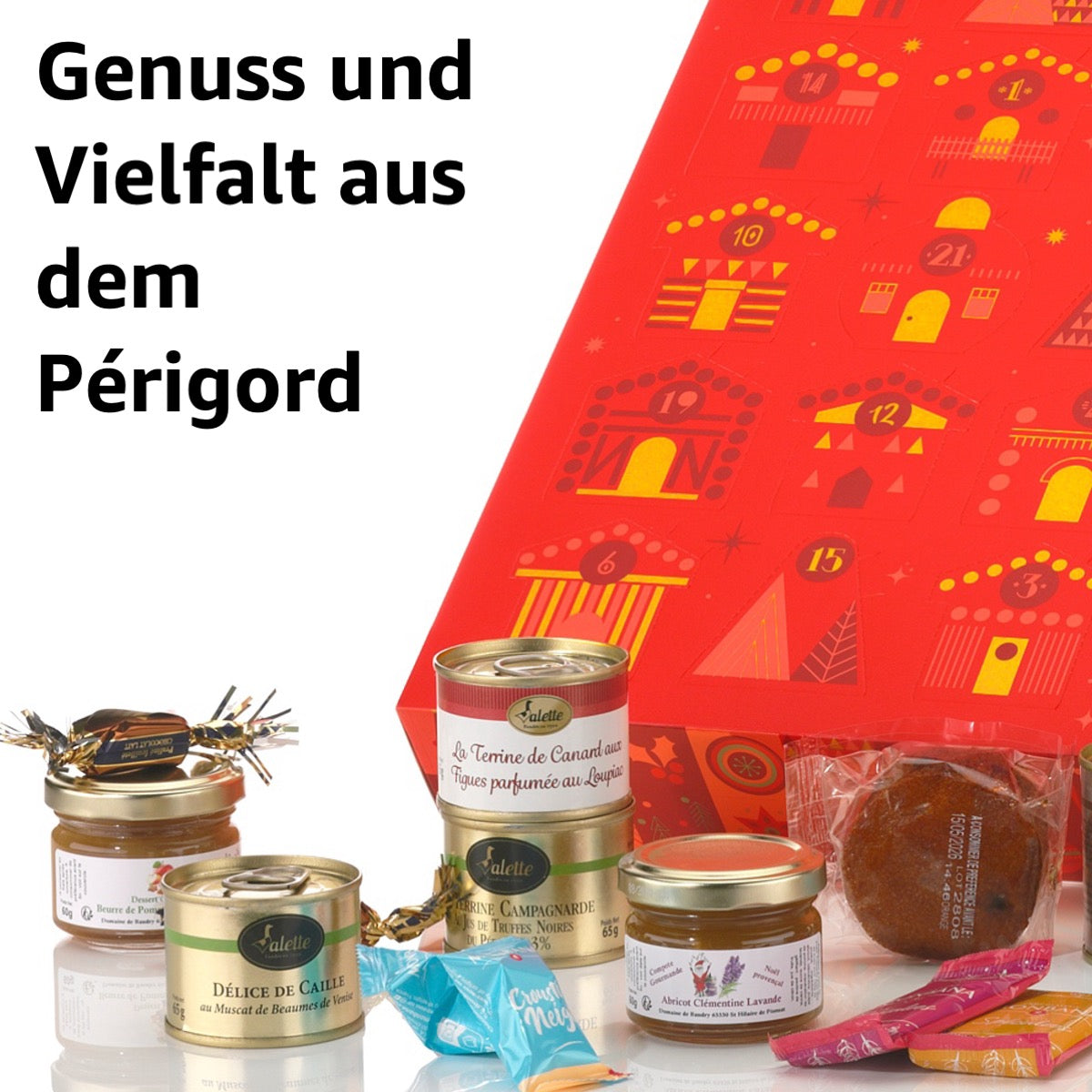 Französischer Delikatessen-Adventskalender mit Feinkost aus dem Périgord. Mit Terrinen, Enten-Paté, edlen Süßigkeiten. Für alle Feinschmecker und Gourmets